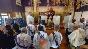 県内でも屈指の大きさを誇る大堂に僧侶、檀信徒(お檀家さん)の51名が参加。開会に先立ち千葉県西部宗務所長 山本隆真僧正より挨拶を頂き、茂原市墨田 妙源寺より本年5月7日に晋山(入寺)されました増田日優猊下からは御開帳と日蓮大聖人の大曼荼羅御本尊にまつわるお話を賜りました。