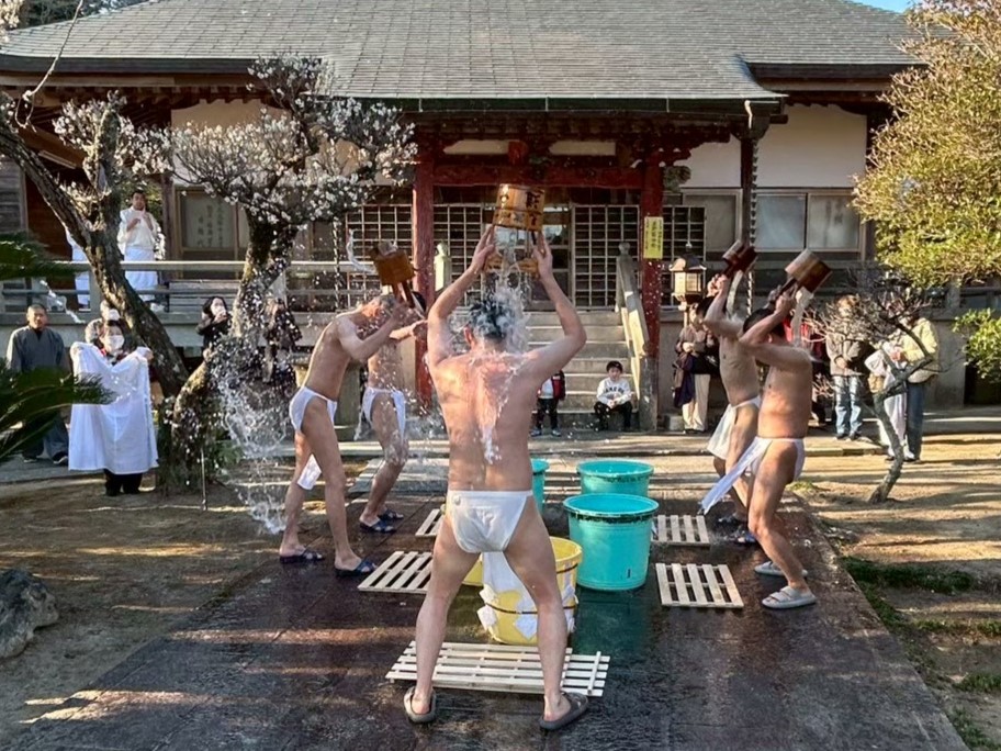 また大寒中の寒空の下、本堂正面にて会員による水行が行われました。希望者も一緒に水行ができるということで、一般参加者も一緒に冷たい水をかぶりました。宝泉寺の檀家様も水行の見学に集まり、迫力のある若い僧侶の姿に感動していました。