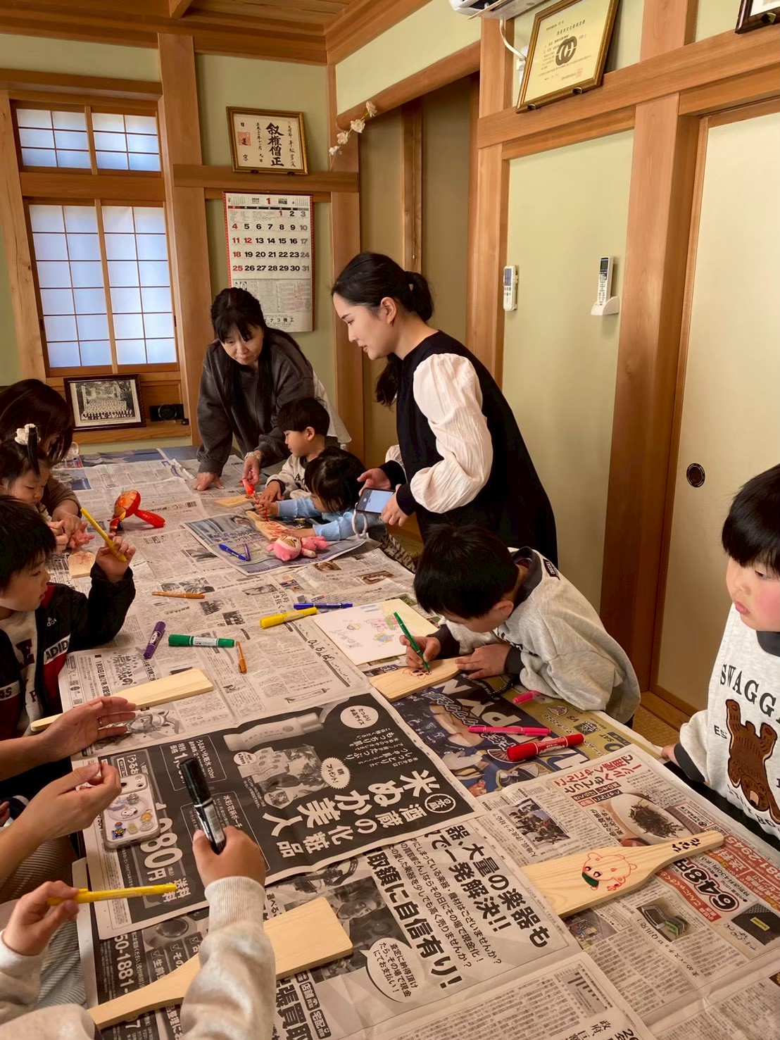 羽子板作りでは板に好きな絵を描いて、作った羽子板を使い、外で羽根つきを行いました。